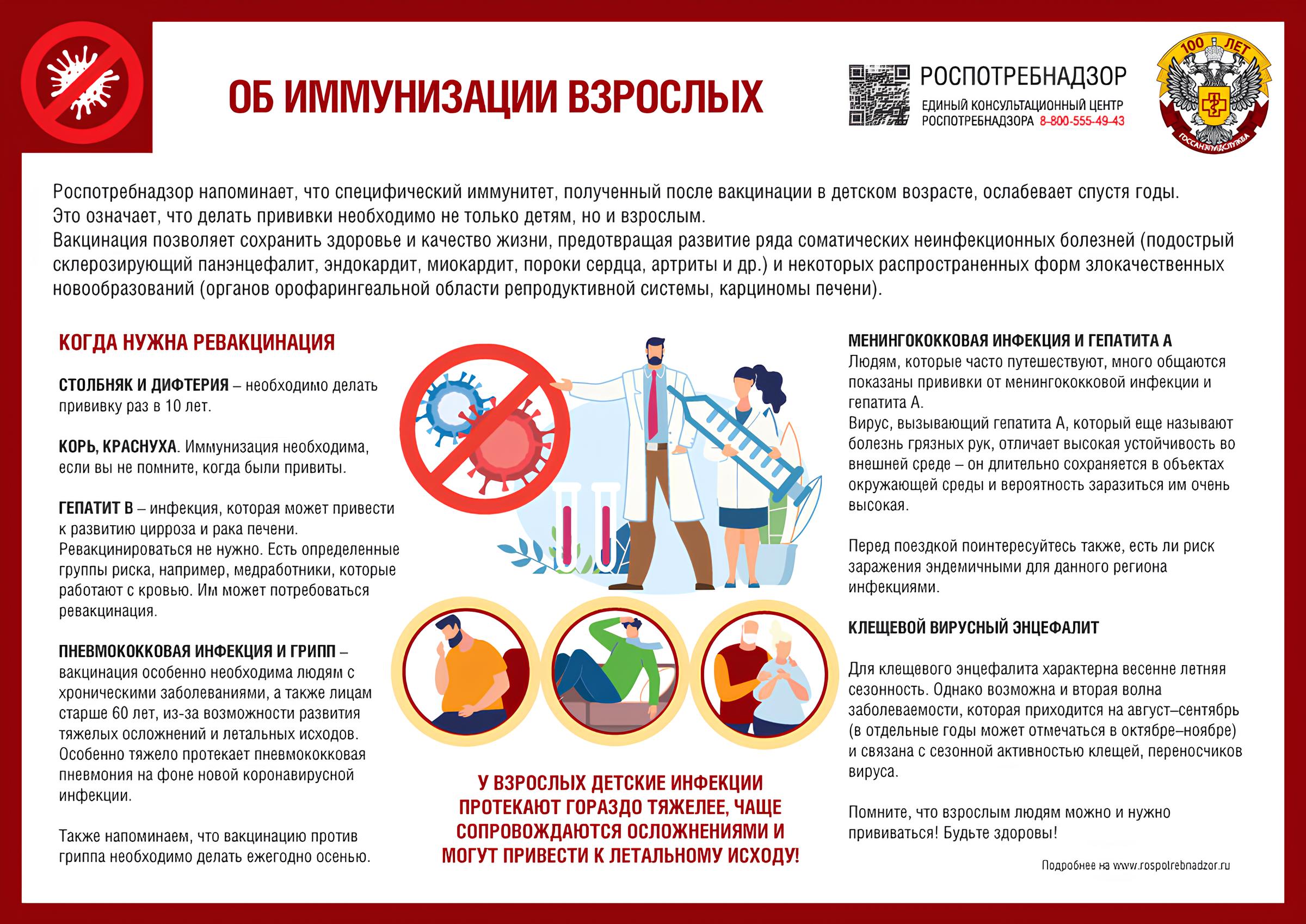 Роспотребнадзор напоминает, что специфический иммунитет, полученный после вакцинации в детском возрасте, ослабевает спустя годы. Это означает, что делать прививки необходимо не только детям, но и взрослым. Вакцинация позволяет сохранить здоровье и качество жизни, предотвращая развитие ряда соматических неинфекционных болезней (подострый склерозирующий панэнцефалит, эндокардит, миокардит, пороки сердца, артриты и др.) и некоторых распространенных форм злокачественных новообразований (органов орофарингеальной области репродуктивной системы, карциномы печени).